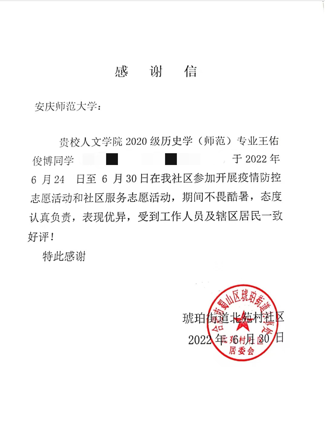 近日,Beat365中文官方网站收到合肥市蜀山区琥珀街道北苑村社区的感谢信。信中对Beat365中文官方网站2020级历史学专业王佑俊博同学暑期疫情防控志愿服务活动予以高度评价。