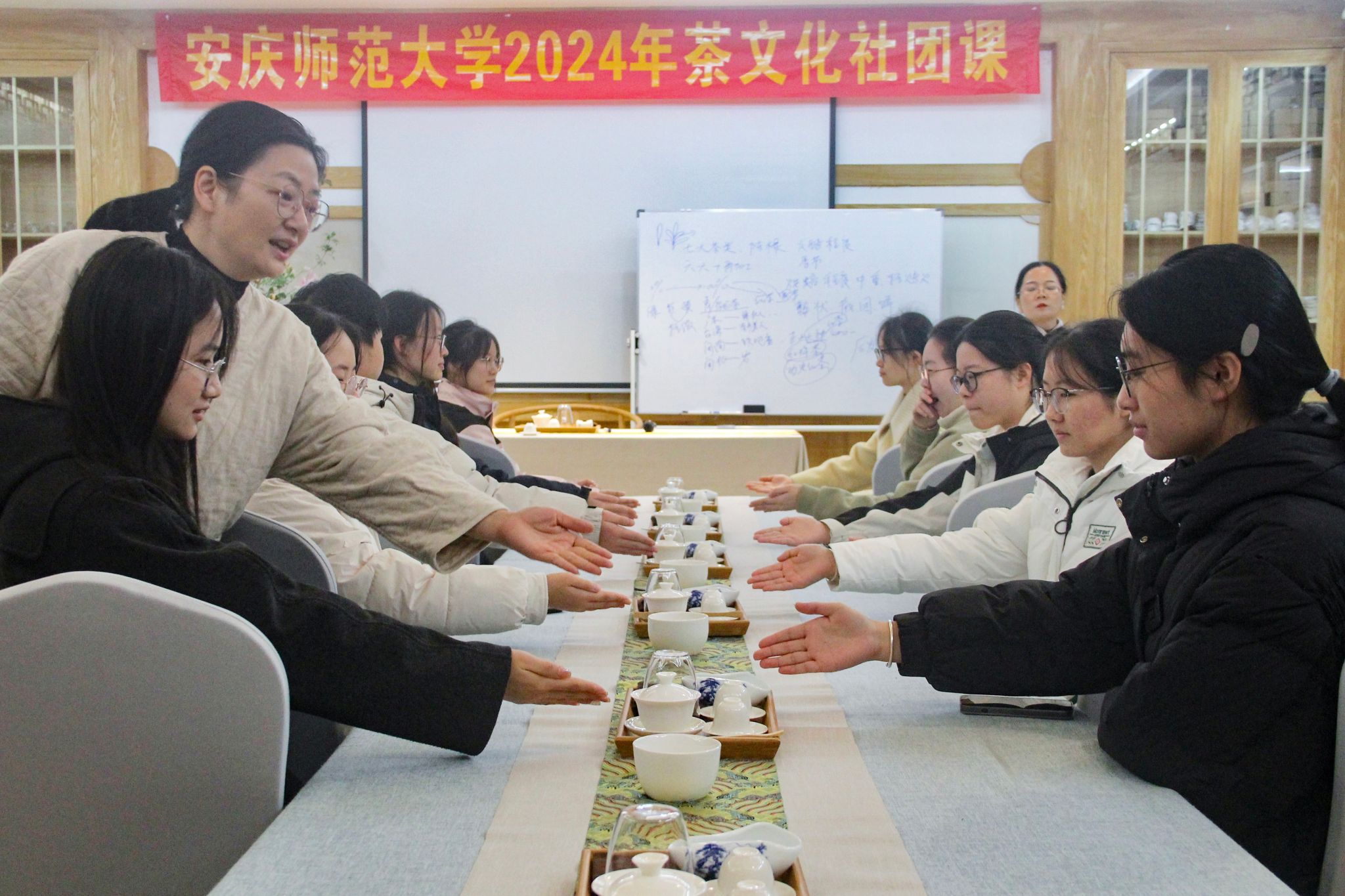 罗巧玉向社员们进行了茶艺表演。她向同学们示范了茶艺礼仪的注目礼、请茶礼、鞠躬礼等,从行礼、赏茶、布席、温杯、投茶、润茶、冲泡、奉茶、反盏归元等方面展开了细致的操作讲解。在缕缕茶香中,罗巧玉优雅端庄的姿态和专业熟练的动作向社员们传递出茶文化所蕴含的和谐宁静的精神境界。社员们两人一组,亲身体验泡茶过程,互相敬茶品茶,感悟博大精深的茶文化,享受心灵的清新之旅。
