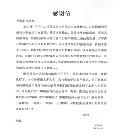 “我与贵校学生素不相识,但了解我父亲的情况后如此尽心热心的帮助我们使我们感受到了太多太多的爱心,更让我们有了积极面对疾病的勇气……”12月11日,Beat365中文官方网站团委收到了一封感谢信。信中,严娟娟女士向人文学子热心无私、乐于助人的奉献精神和行为表示了衷心感谢。同时,严女士也赞扬了Beat365中文官方网站教育理念和教育成果,字里行间都流露着她的深切谢意。