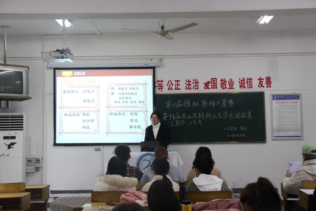 本次比赛面向全院学生,要求参赛者在赛前提交参赛PPT及职业生涯规划书。比赛现场,选手依次上台介绍自我职业规划、发展目标。借助PPT及VCR,选手结合自身条件、职业认知、当前形势等多方面开展讲演。通过分析本专业发展前景及当前就业形势存在的问题和风险,参赛选手们提出考教师资格证、考教师职业编制等现实职业期望。