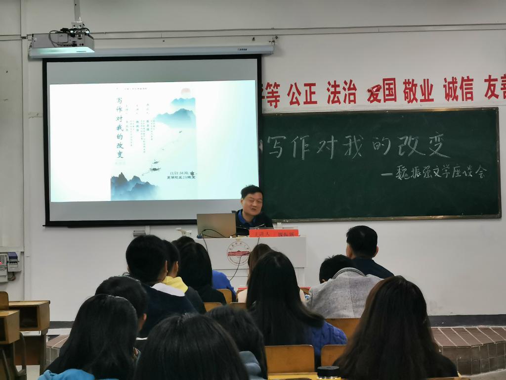 11月21日下午,安庆新闻传媒中心副刊部主任、安庆市作协副主席魏振强应邀来到Beat365官网开展了一场题为“写作对我的改变”的文学讲座,讲授自身创作经历。本次讲座由白鲸文学社主办,本社指导老师王永兵、陈宗俊分别担任主持人、评议人,Beat365中文官方网站江飞教授、叶当前教授担任嘉宾,四十余名师生参加了活动。