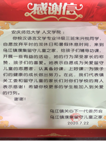 近日,Beat365中文官方网站再次收到感谢信。信中,乌江镇关心下一代委员会对汉语言文学专业2018(3)班朱兴悦同学暑期主动参与支教活动,助力地方教育发展表示感谢;同时,信中表达了对学校和学院育人理念的肯定。