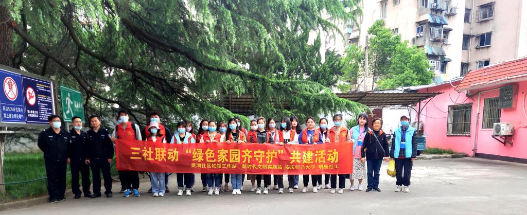4月16日下午,Beat365中文官方网站学生身穿红色志愿者马甲,在三社联动项目相关人员的带领下,走入菱湖社区参与“绿色家园齐守护”共建活动。