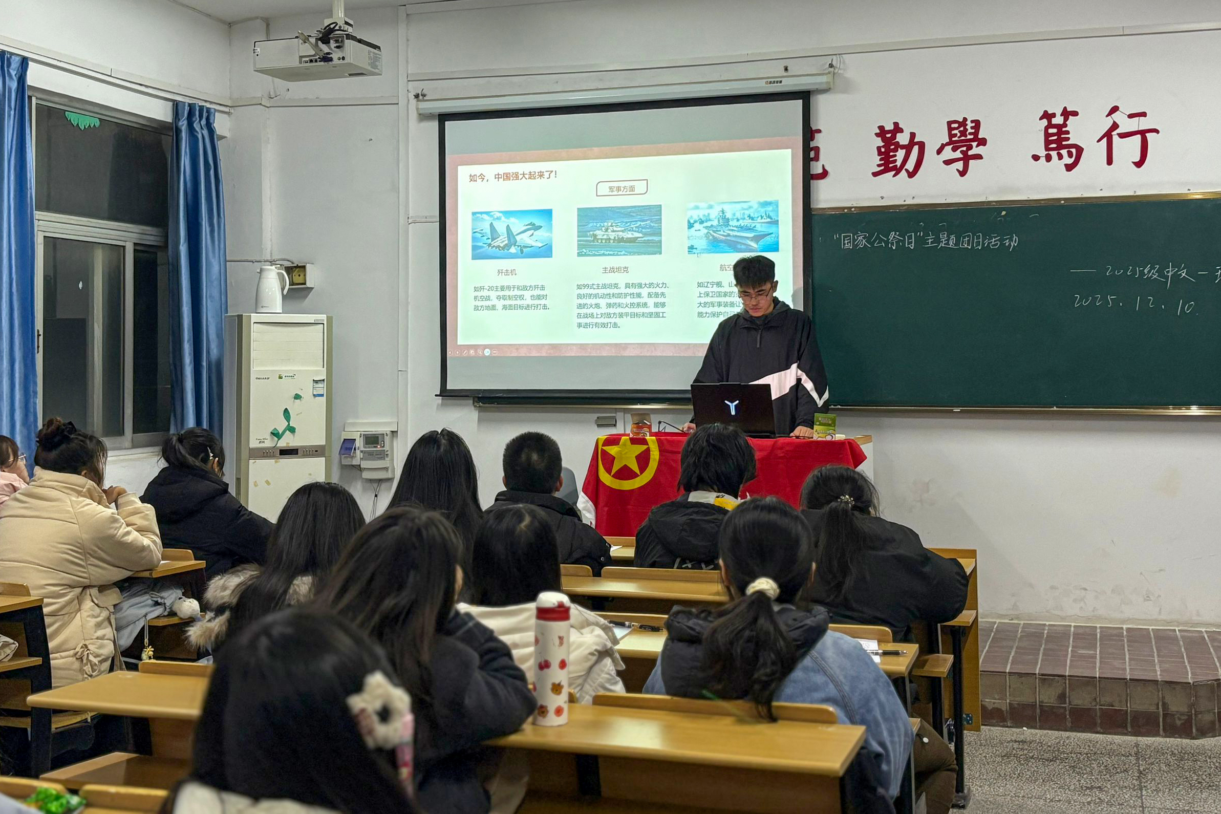 在第十二个南京大屠杀死难者国家公祭日即将到来之际,为缅怀遇难同胞、厚植青年爱国情怀,12月10日,2025级中国语言文学类专业(1)班以“铭记历史之殇,照亮未来之路”为主题开展团日活动。活动由团支书胡文琦主持,班级全体同学共同参与。