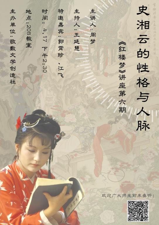 “史湘云的‘真’也体现在‘赤子之心’,同学们需要学习她性格中的‘坚韧洒脱’。此外,在阅读经典时,大家应该抱有做学问的态度,多与他人探讨,不能害怕沟通。”讲座最后,敬敷文学创造社指导教师江飞就学生们的学习方法提出了一些建议。同时,他还提及社团的后续发展会不断丰富讲座形式,争取让学生们可以“登台亮相”,主动分享心得和阅读体会,和老师、嘉宾们一起进行探究性学习。(文/学生记者 虞欣 韩菲旸 图/学生记者 魏文婷 刘菁 审核:王波)