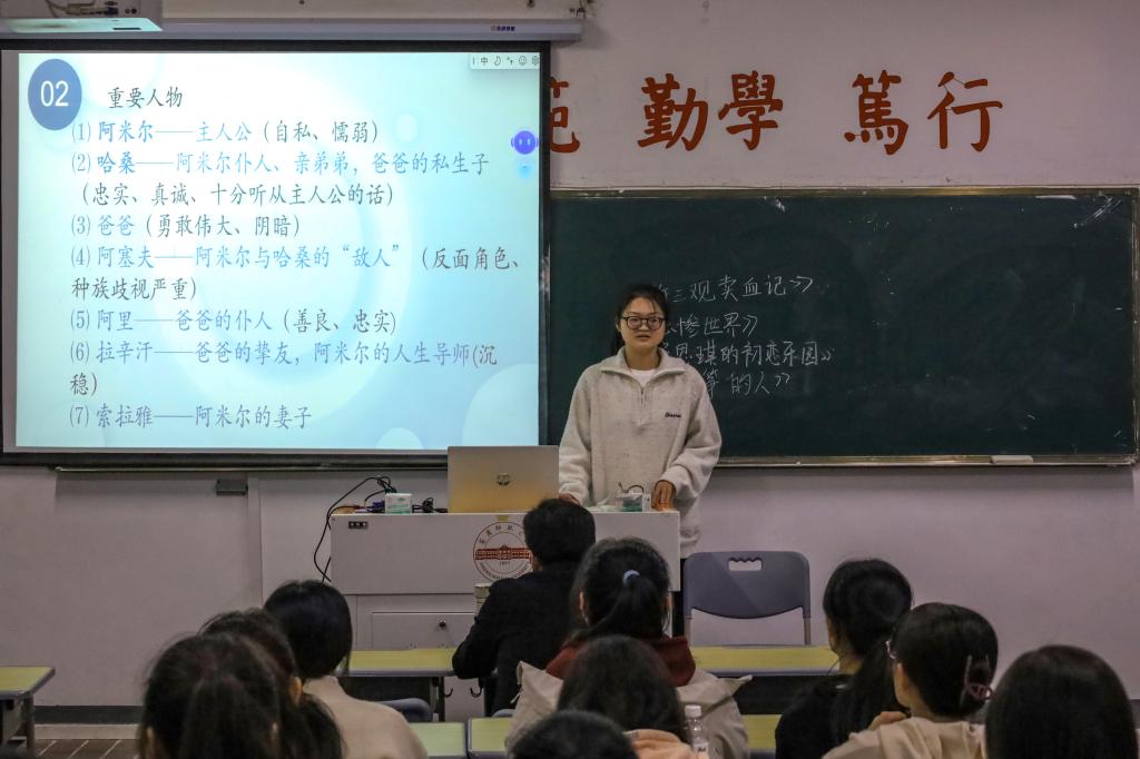“希望我们可以和主人公一样,怀有迎难而上的勇气和信心,勇敢地去追我们的‘风筝’。与其选择在困境中俯首称臣,不如迎着它继续向前。”在王荣鹃看来,《追风筝的人》中的“风筝”是象征性的,它代表着现实生活中一切美好的事物。“我想通过这本书告知大家,不完美的我们在成长过程中终究能追寻到属于我们的‘风筝’。”为了辅助大家理解,王荣鹃特意制作PPT对该书进行详细介绍。