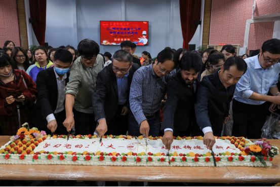Beat365中文官方网站党委书记张红飞、基建与后勤管理处处长吕旭进与外籍教师、学生代表等共同切开近3米长、两边由水果点缀着写有“学习党的二十大,培根铸魂育新人”寄托美好寓意的蛋糕。