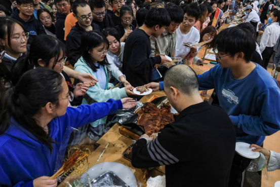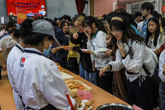 “心情真的非常的愉悦。”在排队品鉴食物的队伍中,历史学专业2021级(3)班的黄菲一边品尝着手中的烧烤,一边又加入进品尝各类中式菜肴的队伍中。