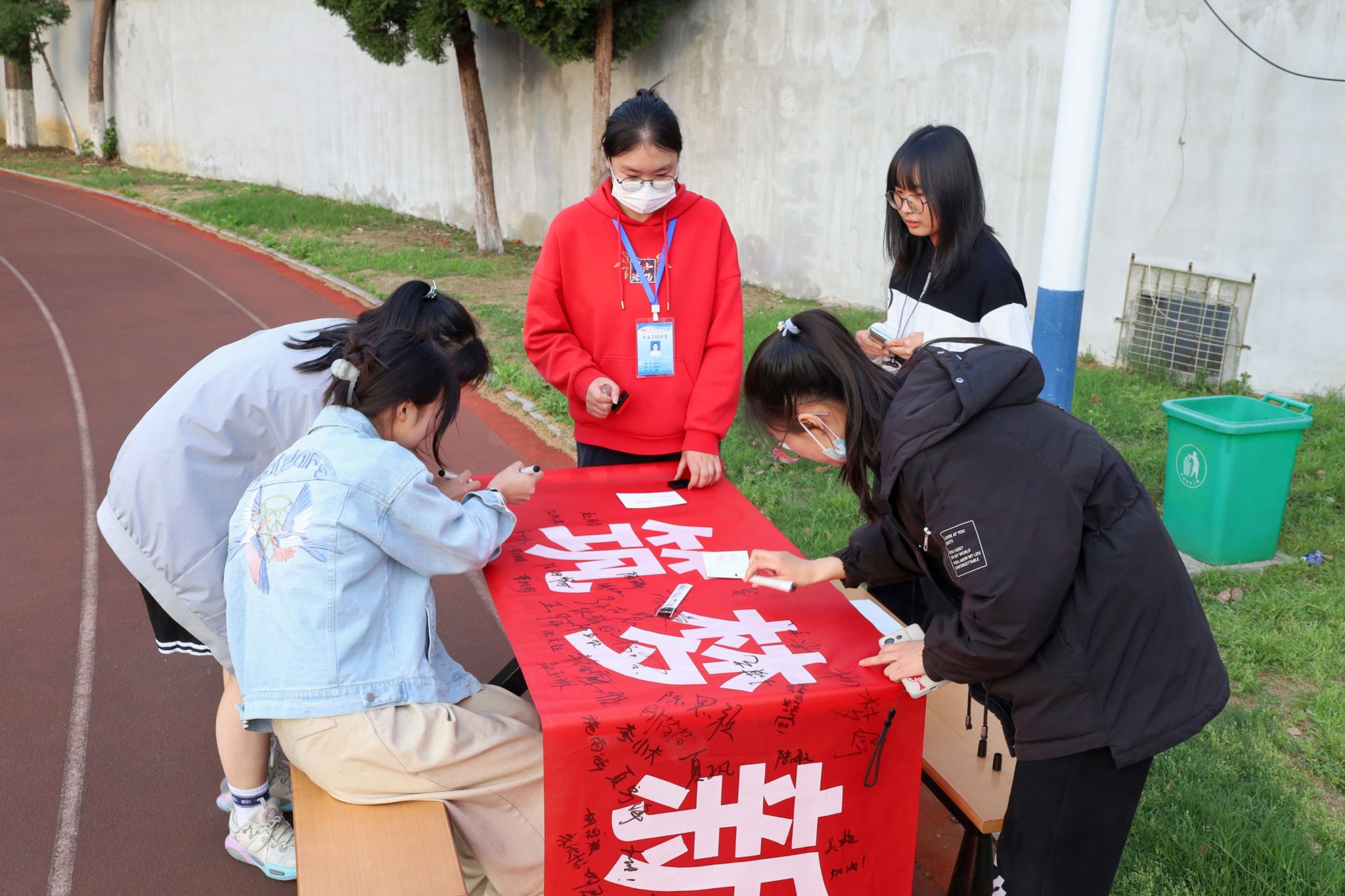 摆放桌椅,摊开横幅,执笔签名……活动伊始,前来参与活动的学生们纷纷拿起记号笔,在标有“奋斗正青春 筑梦新时代”字样的横幅上写下自己的名字。据工作人员介绍,学生们在标有活动主题字样的横幅上签字,寓意“青年怀信念而立”,呼应了本次活动的主题。