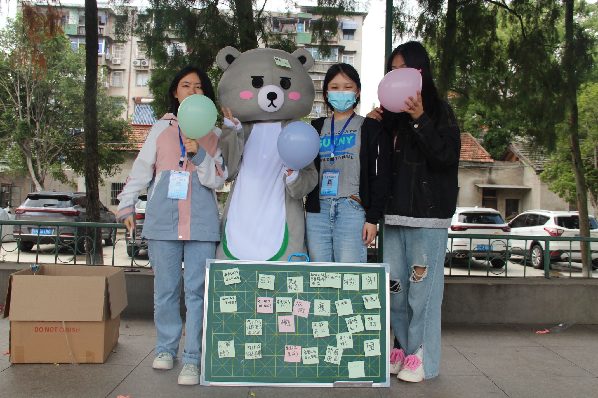 此次的活动形式丰富多彩,心理健康知识教育、有奖问答和游戏互动等环节赢得了同学们的广泛关注,同学们有的在气球上写下自己的烦恼并踩破压力气球,有的撕掉玩偶熊上写满了烦恼的标签,并给玩偶熊一个拥抱,还有的在心情展板上为其他人的困扰解惑……