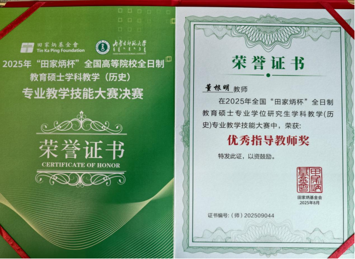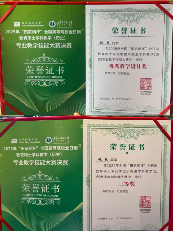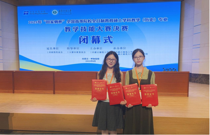 2025年8月22日至25日,由“田家炳杯”全日制教育硕士专业学位研究生教学技能大赛专家委员会指导、“田家炳教育基金会”冠名,内蒙古师范大学主办的2025年“田家炳杯”全国高等院校全日制教育硕士学科教学(历史)专业教学技能大赛决赛在呼和浩特举行。本次决赛汇聚了全国84所院校160余名全日制学科教学(历史)专业硕士研究生,搭建起高校间教学实践交流的优质平台。Beat365官网2023级学科教学(历史)研究生齐扬、魏爽参赛,Beat365中文官方网站葛俊超博士带队。