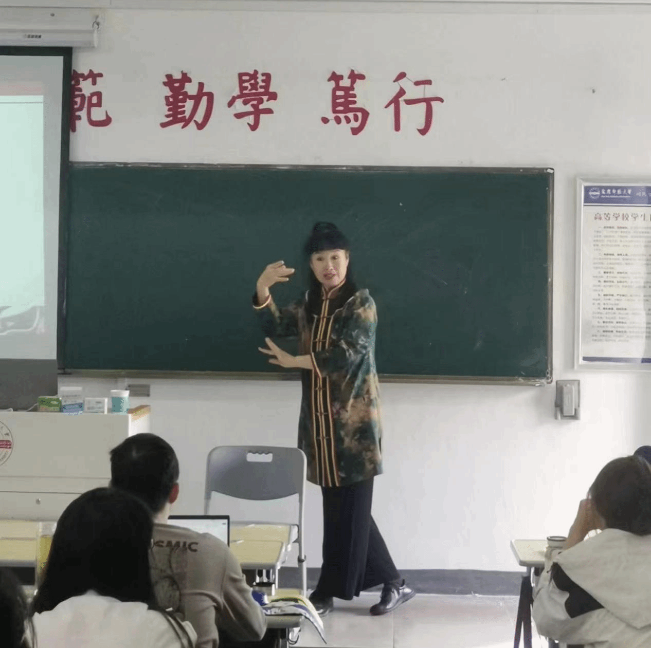 讲座期间,孙萍带领大家诵读富连成社科班训词,表演《霸王别姬》剧目,分析安庆在京剧发展史上的地位,体会富连成科班风格,激发听众兴趣,发掘学术问题,整堂演讲,艺术性与学术性融为一体,讲座现场气氛热烈,掌声不断。