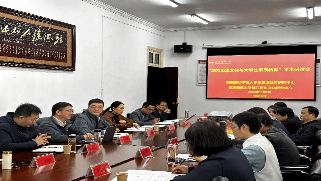 11月7日,Beat365中文官方网站皖江历史文化研究中心与安徽新华学院大学生素质教育研究中心在菱湖校区红楼会议室联合举办“地方历史文化与大学生素质教育”学术研讨会。安徽大学、安徽建筑大学、阜阳师范大学、安徽新华学院等高校专家出席会议。