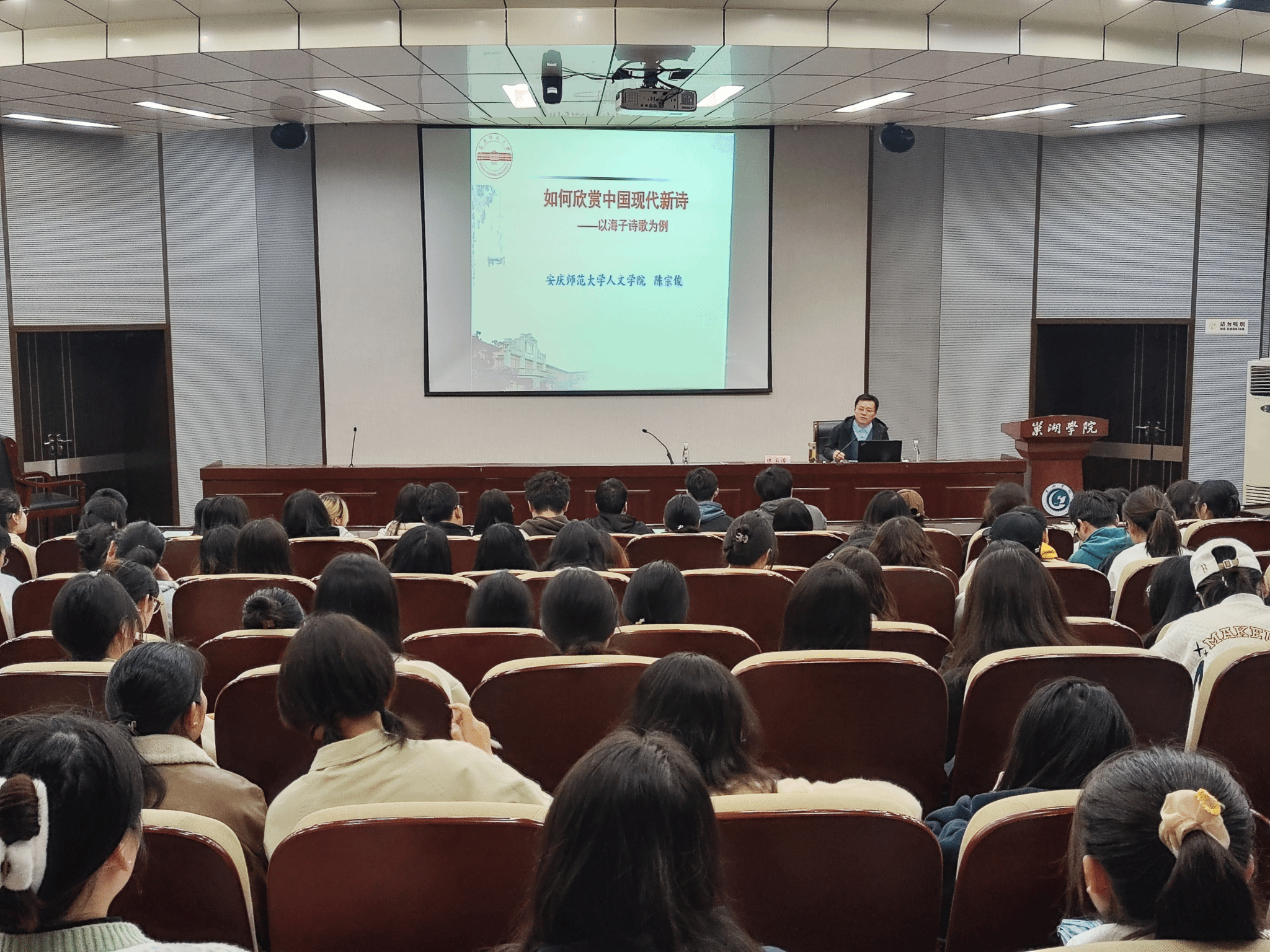 3月23日上午,应巢湖学院文学与传媒学院和科研处的共同邀请,Beat365官网中国现当代文学专业陈宗俊教授赴该校做了题为“如何欣赏中国现代新诗——以海子诗歌为例”的学术讲座。文学与传媒学院汉语言文学专业的全体学生和部分教师近百人聆听了讲座。讲座由该院中文系主任吴强副教授主持。