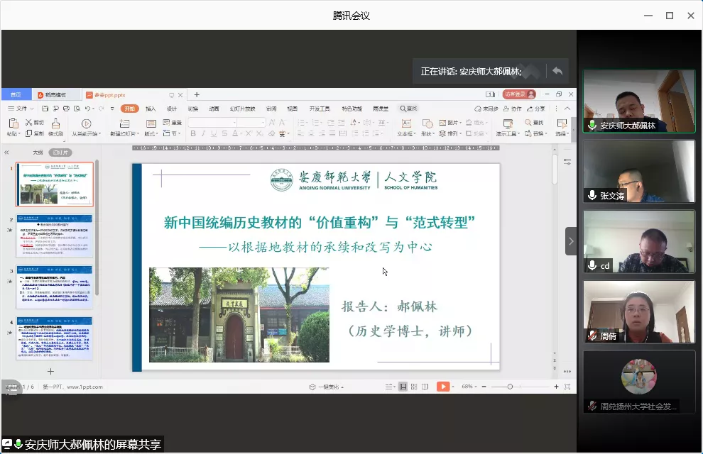 会议由扬州大学社会发展学院、扬州大学历史教育与教材研究中心联合举办,会议采用腾讯会议线上交流方式,全国30余位专家学者作了相关主旨演讲及主题报告,全国230余位高校教师、教研员、中学教师以及硕博士研究生参加了研讨会。本次研讨会全国历史教育专家齐聚扬州,就历史教育理论前沿、历史教育与史学关照、历史教育改革反思、历史教材编纂与运用、历史课堂教学与理解等前沿热点问题展开学术探讨。