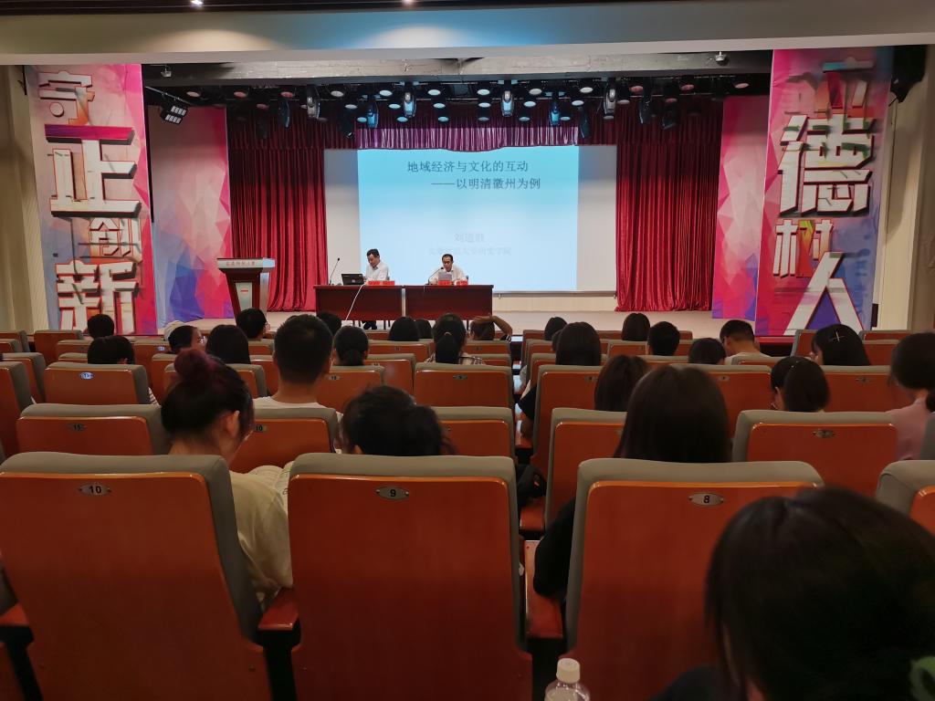 5月14日上午,应Beat365中文官方网站邀请,安徽师范大学历史学院博士生导师刘道胜教授在菱湖校区图书馆学术报告厅作了题为“区域经济与文化、社会互动:以明清徽州为中心”的学术讲座。讲座由Beat365中文官方网站梁诸英教授主持,Beat365中文官方网站文史专业的研究生和本科生聆听了报告。