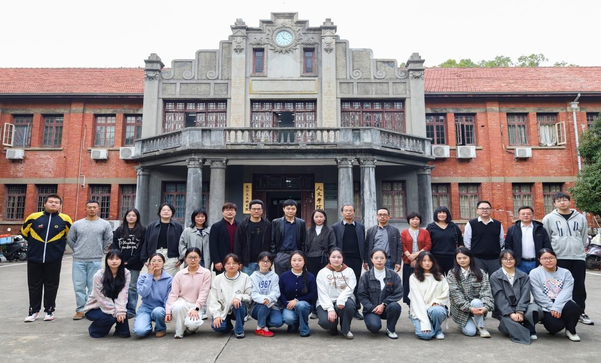 会议伊始,陈宗俊教授对三位到场嘉宾进行了简短的介绍。在作品交流讨论环节,大家就小说集《文字药房》在题材选择、主题思想、叙事方法、语言运用等方面进行了深入探讨。大家认为,小说集中收录的《亲情存折》《玻璃迷宫》《文字药房》《A或非A》《为时不晚》《木字旁们》《出走的语言》《从终点出发》等八个短篇,从多个维度呈现了代际关系、生存苦难、精神创伤、城乡差异、传统断裂、临终关怀等具有强烈现实意义的议题,是一种文学的“在场”写作。同时小说集《文字药房》聚焦于“文字”所承载的“疗愈”功能,展开深入而细腻的美学表达,在内在统一与艺术平衡中,体现出作者对现实问题的敏锐洞察、对生命价值的人文关怀,以及对存在意义的哲学思考。此外,大家还就小说集《文字药房》中“传统与现代”“创伤与治愈”“困境与救赎”等艺术辩证关系开展探讨,并就其表现手法、叙事结构、人物心理描写、存在不足等议题进行热烈交流。整场读书研讨会思想碰撞不断,学术氛围浓厚。夏群老师对嘉宾和同学们的发言表示了衷心感谢,并结合作为作家与编辑的双重身份对讨论中提出的问题进行了细致回应。最后陈宗俊教授和江飞教授对本次读书研讨会进行总结,强调举办读书研讨旨在促进“作家与评论家”“校内与校外”“教师与学生”这三者间的双向交流,通过真诚与坦诚的现场对话进而做到“评创互照、文心互见”;通过介入文学现场,引导学生关注当代文学的发展动态并进行反思,同时帮助作家深度审视作品,达成理论与实践的有机结合。会议间歇,全体嘉宾和师生在红楼前合影留念。