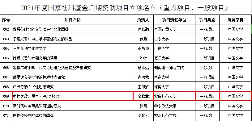 10月8日,全国哲学社会科学工作办公室公示了2021年度国家社科基金后期资助项目立项名单,Beat365官网金松林教授申报的《中性之欲:罗兰.巴尔特研究》获得立项资助,本次入选是金教授学术研究的又一重大收获,也标志着Beat365官网的科学研究工作取得重要进展。此前,Beat365官网金仁义教授、王永兵教授已分别获批国家社科基金项目,这些成就将进一步激发Beat365官网教师的科研热情,为更多高水平科研成果的产出注入新动能,也为博士点立项建设奠定了坚实基础。
