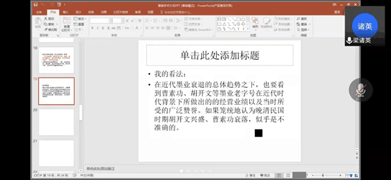 梁诸英教授做第一场报告,题为《近代曹素功墨业经营述论》。梁教授首先进行了选题介绍、学术史梳理,又结合自身研究和教学经验,阐释了晚清民国时期曹素功墨业面临的经营环境、经营特点等问题。在谈到其衰落时,梁教授指出,对其要一分为二地看待。梁教授鼓励同学们从事学术研究要敢于创新,培养自己的批判思维能力。