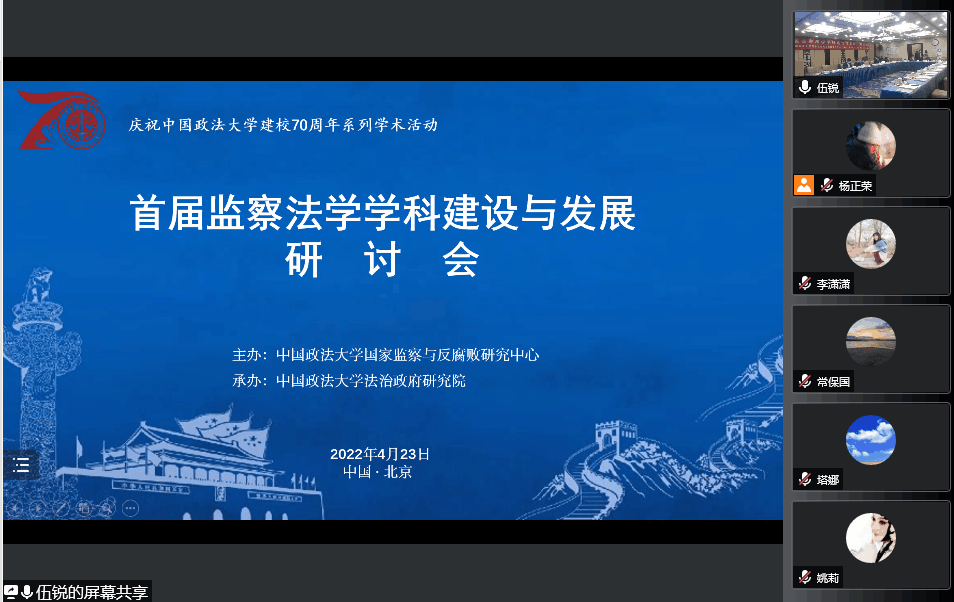 4月23日,由中国政法大学国家监察与反腐败研究中心主办,中国政法大学法治政府研究院承办的“首届监察法学学科建设与发展”研讨会以线上与线下相结合的方式召开。会议邀请了中国法学领域尤其是监察法学方向的数十名专家参与,会议日程主要涉及监察法学学科属性及定位、监察法学基本研究范畴以及监察法学教学方法与研究方法等前言议题。Beat365官网李正君博士也应邀参与了此次研讨会。
