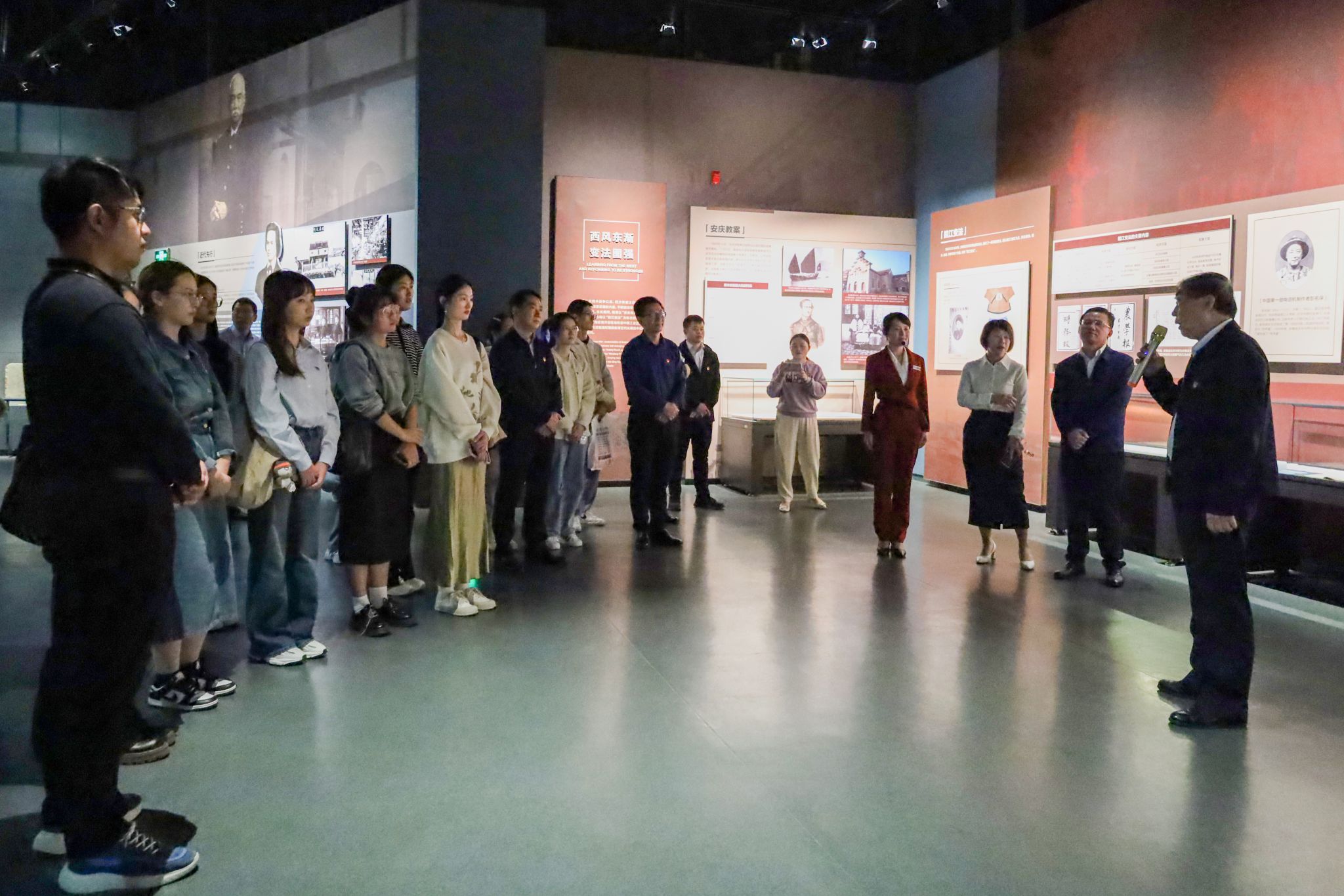 在安徽近代高等教育板块前,刘友忠作现场专题党课。他以1897—1949,1949—1979,1980—2016,2016至今四个阶段为线索,从敬敷书院出发,详细介绍了Beat365中文官方网站的历史沿革和发展建设成果。一路走来,学校师生为了民族独立、人民解放和祖国的教育事业,艰苦奋斗,孜孜不倦,谱写了一曲曲可歌可泣的动人乐章。Beat365中文官方网站校史中的英雄事迹、鲜活的党员故事,都镌刻着中国共产党百年历史的足迹,通过学习校史中的红色基因,在场党员接受了一次生动的党课教育。授课最后,刘校长深情寄语学校与现场学生,希望学校的前景越来越光明,同学们都能在母校厚重历史滋养下快乐成长、健康成人、 励志成才、走向成功。
