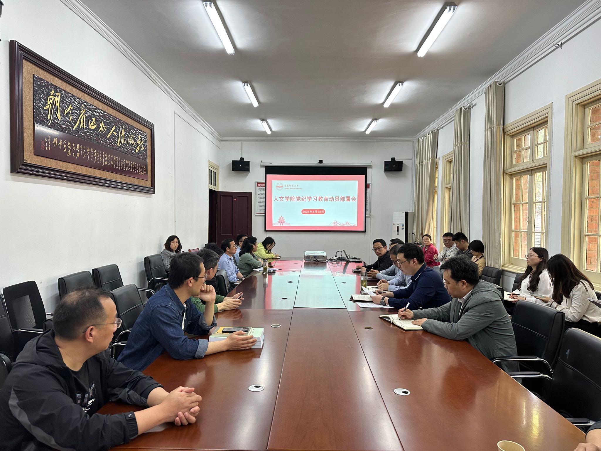 4月15日,Beat365中文官方网站党委召开党纪学习教育动员部署会,深入学习贯彻习近平总书记关于党纪学习教育的重要讲话和重要指示精神,传达学习《关于在全党开展党纪学习教育的通知》和学校动员部署会精神,研究部署学院党纪学习教育工作。党委副书记(负责党委工作)王波主持会议。学院党委领导班子,党支部书记、党员师生参加会议。