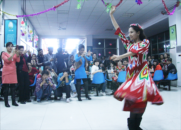 联欢会上,新疆班学员除了表演独具风情的新疆舞蹈、歌曲,几位女学员还合唱了黄梅戏经典唱段《天仙配》,引起一阵欢呼。当晚,许多汉族同学也加入到晚会中,大家一起唱新疆歌、跳新疆舞,节日的气氛感染了在场的所有人,“我还是第一次吃这么纯正的新疆点心呢,真的很好吃。”来自文学院新闻学11(1)班的陈忆竹拿着一块点心赞不绝口:“他们太热情了,只要音乐一响,就会有一群人唱啊跳啊,他们还把我拉进队伍中,教我维族舞蹈,这气氛比我们过年还热闹。”