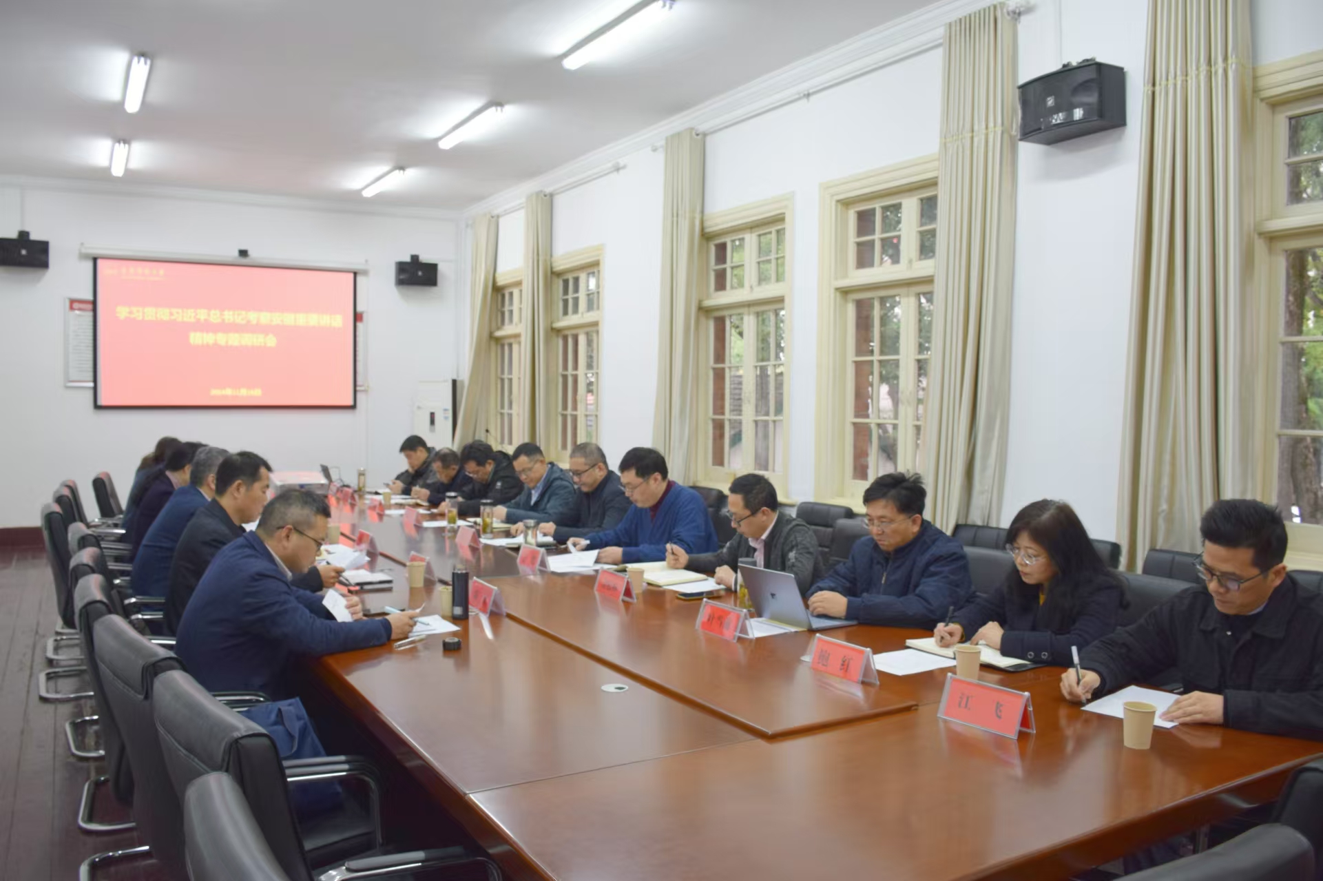 李福华强调,要深刻认识习近平总书记考察安徽重要讲话的重大意义。习近平总书记的重要讲话,深刻阐明了事关安徽长远发展的一系列方向性、根本性、全局性重大问题,是新时代新征程推动安徽各项事业行稳致远的根本遵循。学习好、宣传好、贯彻好习近平总书记考察安徽重要讲话精神,是当前和今后一个时期重要政治任务,全校上下要将讲话精神落实到教育教学、科学研究和人才培养的具体任务中来。要认真学习贯彻省委十一届八次全会精神,牢牢把握多重国家发展战略机遇期,推动学校高质量发展和重点工作落地见效。要把中华优秀传统文化创造性转化、创新性发展作为学校文化建设、和文脉、文风传承的重要抓手,加强有组织科研,深入开展徽州文化、长江文化、黄梅戏文化等研究。立足学校办学定位和发展思路,健全课程体系、打造活动品牌、提升交流平台,拓展育人路径。要围绕立德树人根本任务,以文育人、以文化人、以文铸魂,积极服务文旅支柱产业、大黄山战略等,在深度转型中提升育人水平,将文化资源转化成为育人成效。