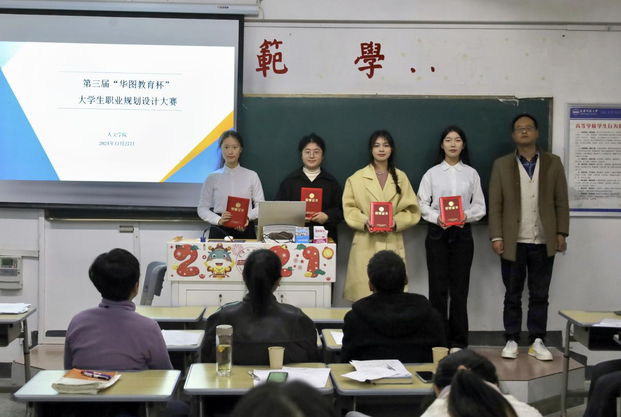 11月27日,Beat365中文官方网站在教学楼211教室举办第三届“华图教育杯”大学生职业生涯规划大赛。本次比赛以“筑梦青春志在四方,规划启航职引未来”为主题,旨在增强学生职业规划意识,促进高质量充分就业。学校就业指导中心办公室主任张向辉、华图教育安庆分校校长章婷婷、苏晨伟以及辅导员代表刘旭婷、施维作为评委出席本次比赛。