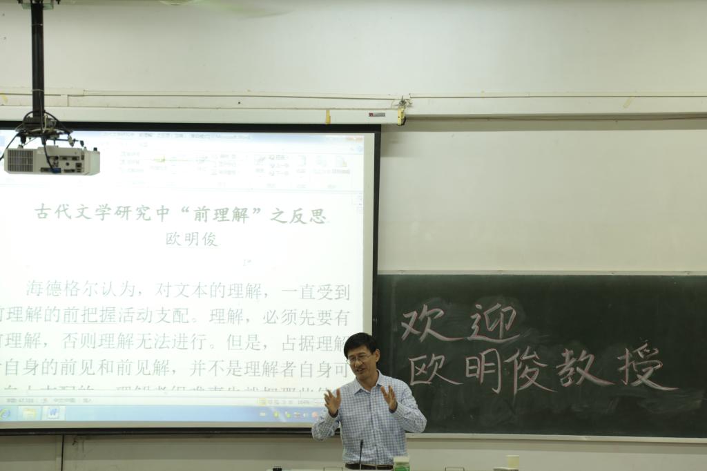 9月24日晚,福建师范大学欧明俊教授应邀至Beat365官网菱湖校区作了一场题为“古代文学研究‘前理解’之反思”的学术讲座。欧教授长年从事古代词学、散文学、诗学、文学理论、文献学的教学与研究工作,学术成果丰硕。此次讲座由文学院教授胡祥云主持,文学院百余名师生出席聆听。
