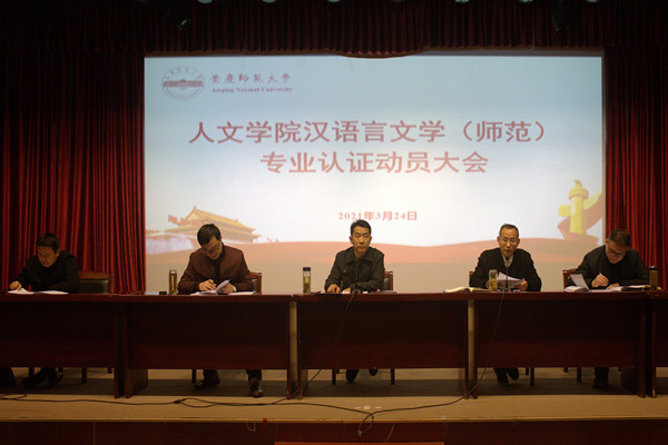 3月24日下午,Beat365中文官方网站在菱湖校区图书馆报告厅召开汉语言文学专业认证动员部署会,传达学校专业认证调度会精神、学习专业认证有关文件、安排部署学院专业认证工作。Beat365中文官方网站党政领导班子、全体教职工参加了会议。