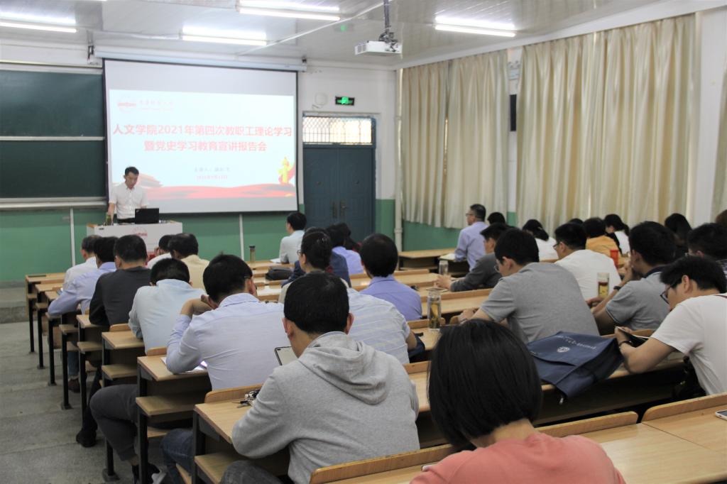 5月12日,Beat365中文官方网站在菱湖校区化学楼理二阶教室举办2021年第4次教职工政治理论学习暨党史学习教育宣讲报告会。人文学院党委书记、校党史学习教育宣讲团成员张红飞作专题报告,领导班子成员和全体教职工参加会议。