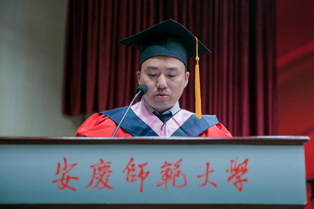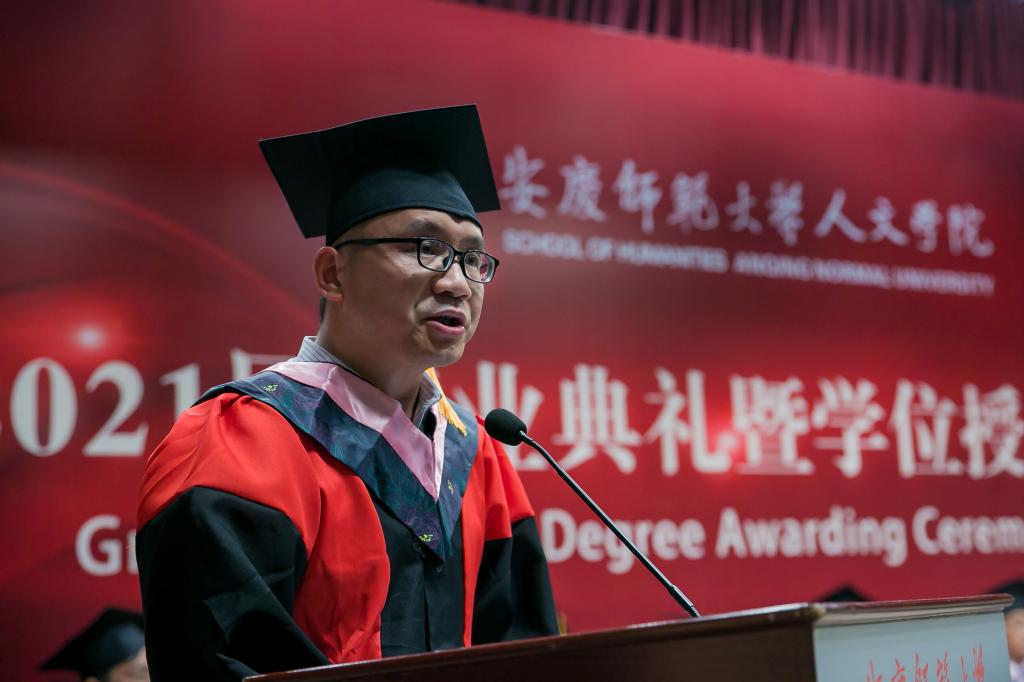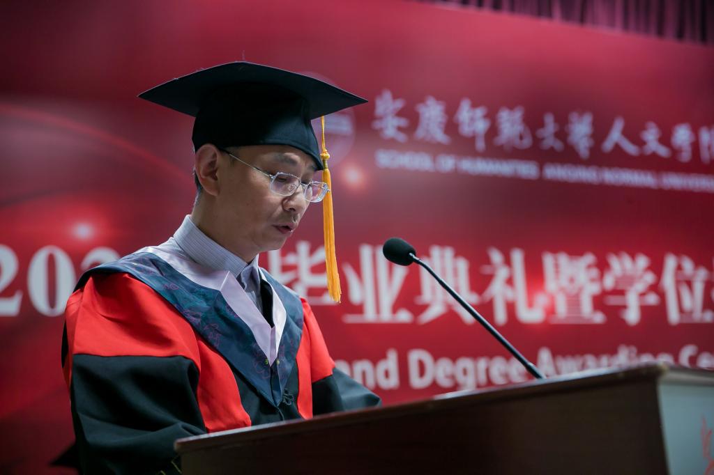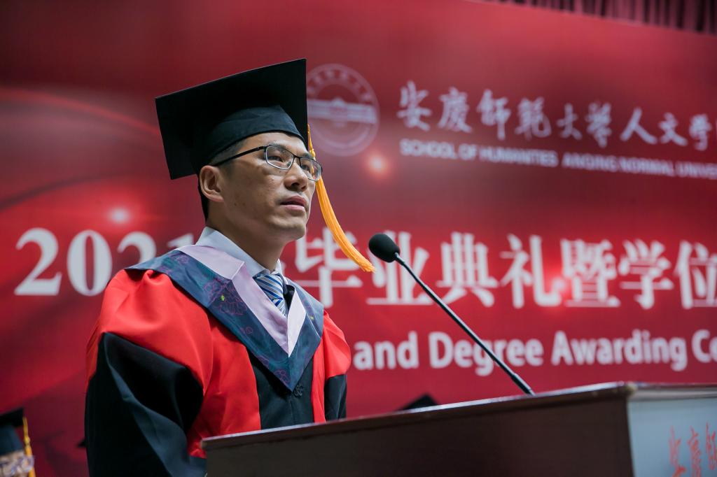 校“三全育人”最美教师、Beat365中文官方网站教授、硕士生导师江飞作为教师代表为毕业生送上祝贺与期待。他勉励毕业生永远不要忘记自己作为人文知识分子身份和责任,成为一个脚下有根心中有光的人。