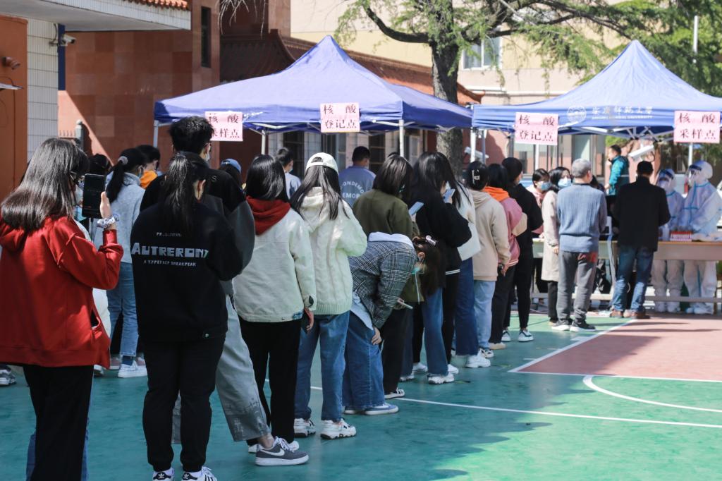 在核酸采集现场,师生自觉佩戴口罩,有序排队,分批进入,保持距离,排队等候,即采即走。医务人员身着防护服,戴口罩、护目镜和医用一次性手套,严格按照规范检测流程进行信息登记,核酸采样。整个过程有条不紊,井然有序。