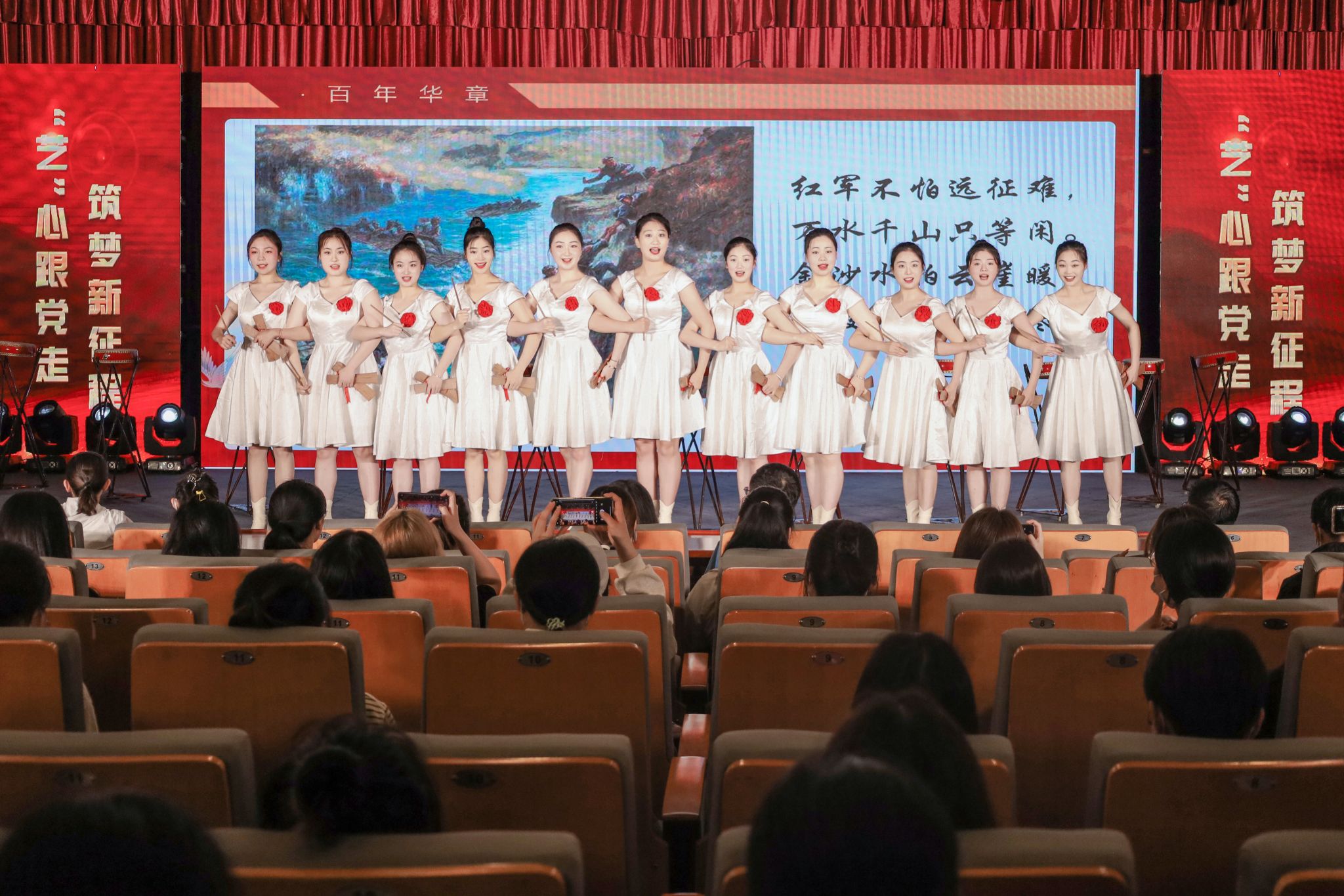 百年奋斗,百年追梦,百年恰是风华正茂。黄梅剧艺术学院11名学子胸口配花,身着统一服饰,带来黄梅大鼓表演《百年华章》。节目融入传统的黄梅调音乐唱腔元素,学生们在舞台上唱大鼓、打竹板,温婉中不失气势,豪迈中柔情尚存。婉转的戏腔,自然的神情,铿锵有力的击鼓,学生们通过不同的唱词和舞台走位,生动演绎了党在不同历史阶段的发展历程。