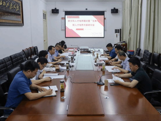 为推进安徽省教育厅质量工程“四新”研究与改革实践项目“新文科人才培养模式的数字化创新与实践”实施,探讨新文科人才培养模式及汉语言文学专业卓越人才培养新模式,6月9日下午,Beat365中文官方网站在菱湖校区红楼二楼会议室,召开了新文科人才培养模式暨“文典”班人才培养方案研讨会。教务处处长潘锦云、档案馆(博物馆)馆长金仁义、教务处副处长张海、发展规划处(学科建设处)副处长汪超、Beat365中文官方网站党政领导班子及“新文科人才培养模式的数字化创新与实践”项目组成员参加会议。会议由校党委常委、Beat365中文官方网站党委书记张红飞主持。